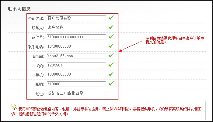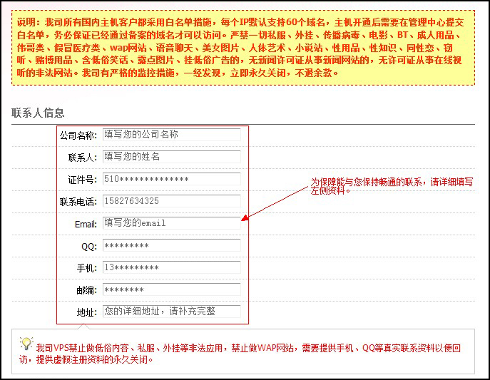 為保障服務(wù)質(zhì)量,能在任何時候聯(lián)系到您,聯(lián)系人信息部分,請務(wù)必填寫真實有效信息,否則審核時VPS可能會斷網(wǎng)。 同時我司用紅色字體標注了不允許防止的內(nèi)容,請仔細閱讀,一經(jīng)發(fā)現(xiàn)違規(guī)內(nèi)容將立即永久關(guān)閉。如圖: