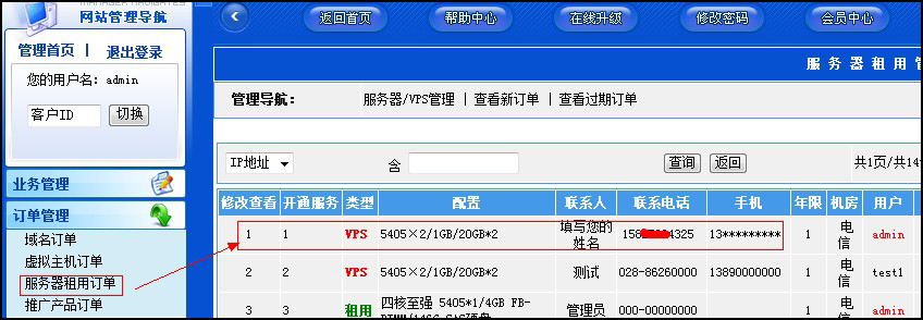 客戶在代理平臺提交訂單后,管理員可以登陸代理平臺后臺,在“訂單管理”—“服務(wù)器租用訂單”看到VPS的訂單,并按照訂單 要求在我司開通VPS。如圖(客戶訂單):