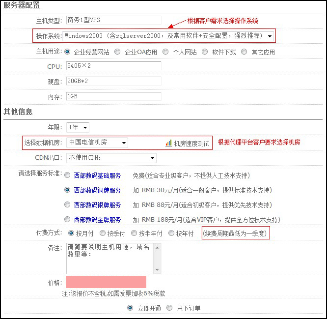 “服務(wù)器配置”部分,選擇操作系統(tǒng)時請根據(jù)客戶在代理平臺提交時選擇的類型來選擇。 “其他信息”部分,選擇機房時請根據(jù)客戶在代理平臺提交時選擇的線路來選擇。若您賬戶下有款可以點擊直接開通,若無足夠款項可以選擇只下訂單,然后勾選“我已閱讀并同意 西部數(shù)碼主機租用協(xié)議”。如圖(服務(wù)器配置和其他信息):