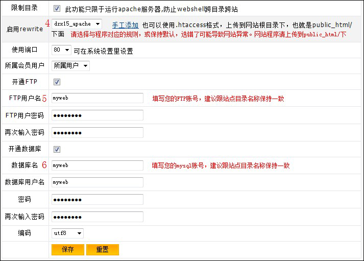 4、偽靜態(tài)設(shè)置,請(qǐng)保持默認(rèn)“無(wú)”,或者選擇對(duì)應(yīng)的偽靜態(tài)配置,若自己不清楚是哪個(gè)版本,請(qǐng)選擇“無(wú)”。 5、填寫FTP賬號(hào)和密碼,建議跟站點(diǎn)目錄名稱一致,方便管理 6、填寫mysql數(shù)據(jù)庫(kù)名和密碼,建議數(shù)據(jù)庫(kù)名、數(shù)據(jù)庫(kù)用戶名和站點(diǎn)目錄名稱一致,方便管理。
