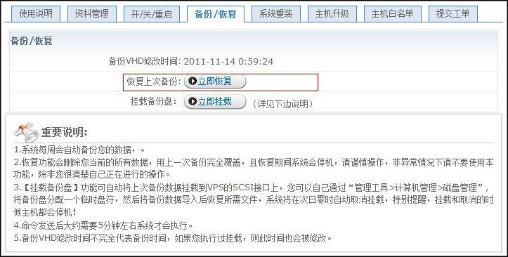 選擇“掛載備份盤”,即可將上次的備份掛載到您的系統(tǒng)下,掛載將會(huì)在次日凌晨取消,掛載操作和取消操作將會(huì)重啟您的服務(wù)器。掛載操作后備份的VHD修改時(shí)間將會(huì)發(fā)生變化,若要恢復(fù)備份到掛載前,請(qǐng)備份好數(shù)據(jù),謹(jǐn)慎選擇。如圖: