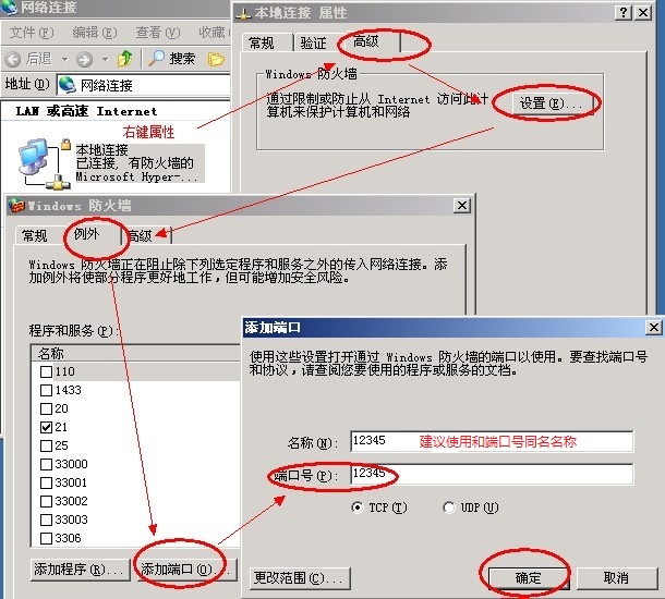 在防火墻設(shè)置中,選擇“例外”,添加需要開啟的遠程端口號(注:12345為示范端口),整個操作如圖所示: