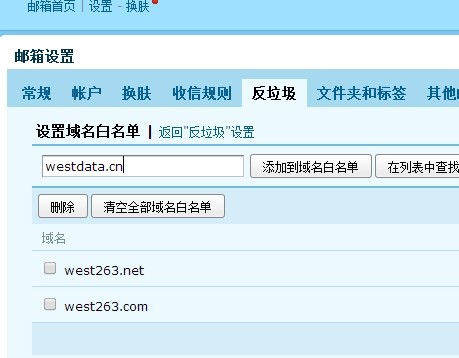 2.在 反垃圾郵件--白名單--設(shè)置域名白名單 3.添加域名west263.net 到白名單里面保存 (我們的發(fā)件地址為 noreply***@west263.net )