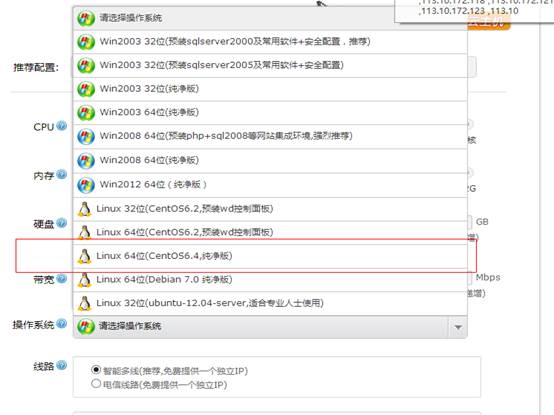 本文檔旨在指導(dǎo)用戶(hù)如何第一次部署和使用負(fù)載均衡: 環(huán)境設(shè)置 使用負(fù)載均衡,您需要一臺(tái)服務(wù)器的系統(tǒng)為linux,我們強(qiáng)烈建議您將安裝負(fù)載均衡的服務(wù)器系統(tǒng)設(shè)置為CentOS 6.4 64位。如下圖 1-1 所示。您也可通過(guò)“客戶(hù)管理中心”->“業(yè)務(wù)管理”->“獨(dú)立IP主機(jī)管理”,選擇現(xiàn)有的彈性云服務(wù)器,單擊右側(cè)的“管理”, 如圖 1-2 所示。在服務(wù)器管理界面,選擇“重裝”,并選擇紅框中的系統(tǒng)類(lèi)型,如圖1-3所示 圖 1-1