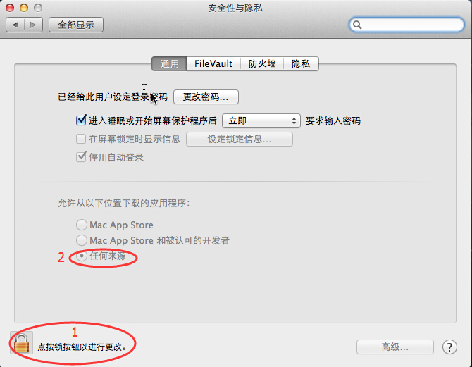 若安裝時提示“您的安全性偏好設置僅允許安裝來自 Mac App Store 和被認可的開發(fā)者的應用程序。” 請依次打開“系統(tǒng)偏好設置”——“安全性與隱私”。點擊左下角的鎖,輸入管理員密碼解鎖后, 在“允許從以下位置下載的應用程序”后選擇“任何來源”,即可正常安裝該軟件。如圖: