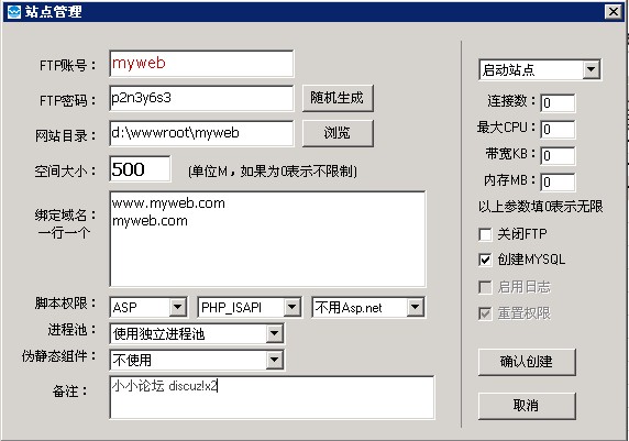 1. 網(wǎng)站管理:一鍵添加網(wǎng)站(IIS)、添加網(wǎng)站FTP、自定義網(wǎng)站目錄、創(chuàng)建MySql數(shù)據(jù)庫(kù)、自定義網(wǎng)站支持腳本(如:asp/php/asp.net)、站點(diǎn)權(quán)限獨(dú)立設(shè)置。