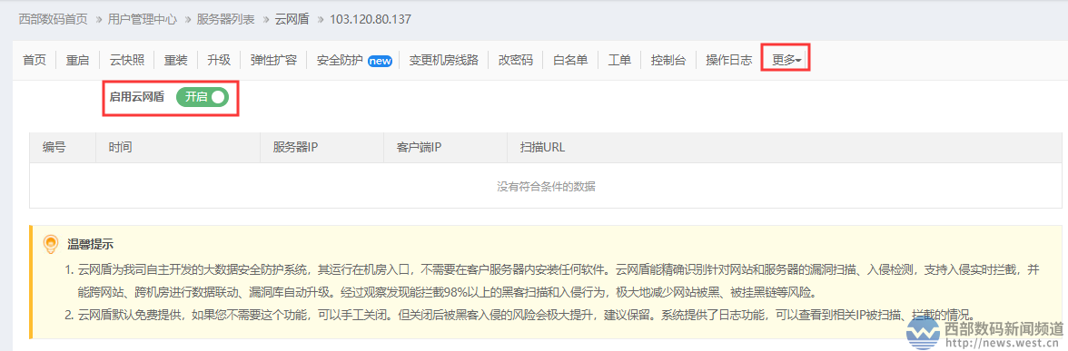 云網(wǎng)盾開啟/關閉操作步驟如下:登錄西部數(shù)碼云服務器管理中心——服務器管理——更多——啟用/關閉云網(wǎng)盾。