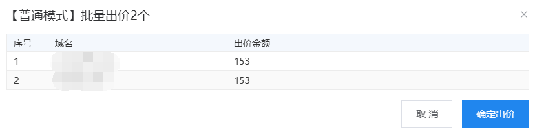 在競價過程中,出價時可根據(jù)需求選擇“普通模式”與“實(shí)付模式”。勾選多個域名進(jìn)行批量出價后,將會出現(xiàn)彈框,確認(rèn)無誤后點(diǎn)擊“確認(rèn)出價”,系統(tǒng)將據(jù)此預(yù)算進(jìn)行出價。