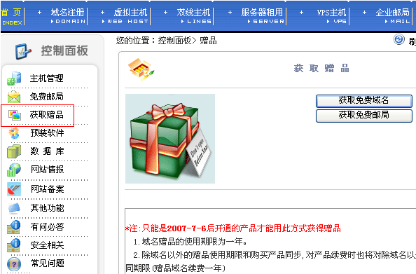 進入虛擬主機管理中心,點擊“獲取贈品”即可在線開通贈送的域名和企業(yè)郵局。